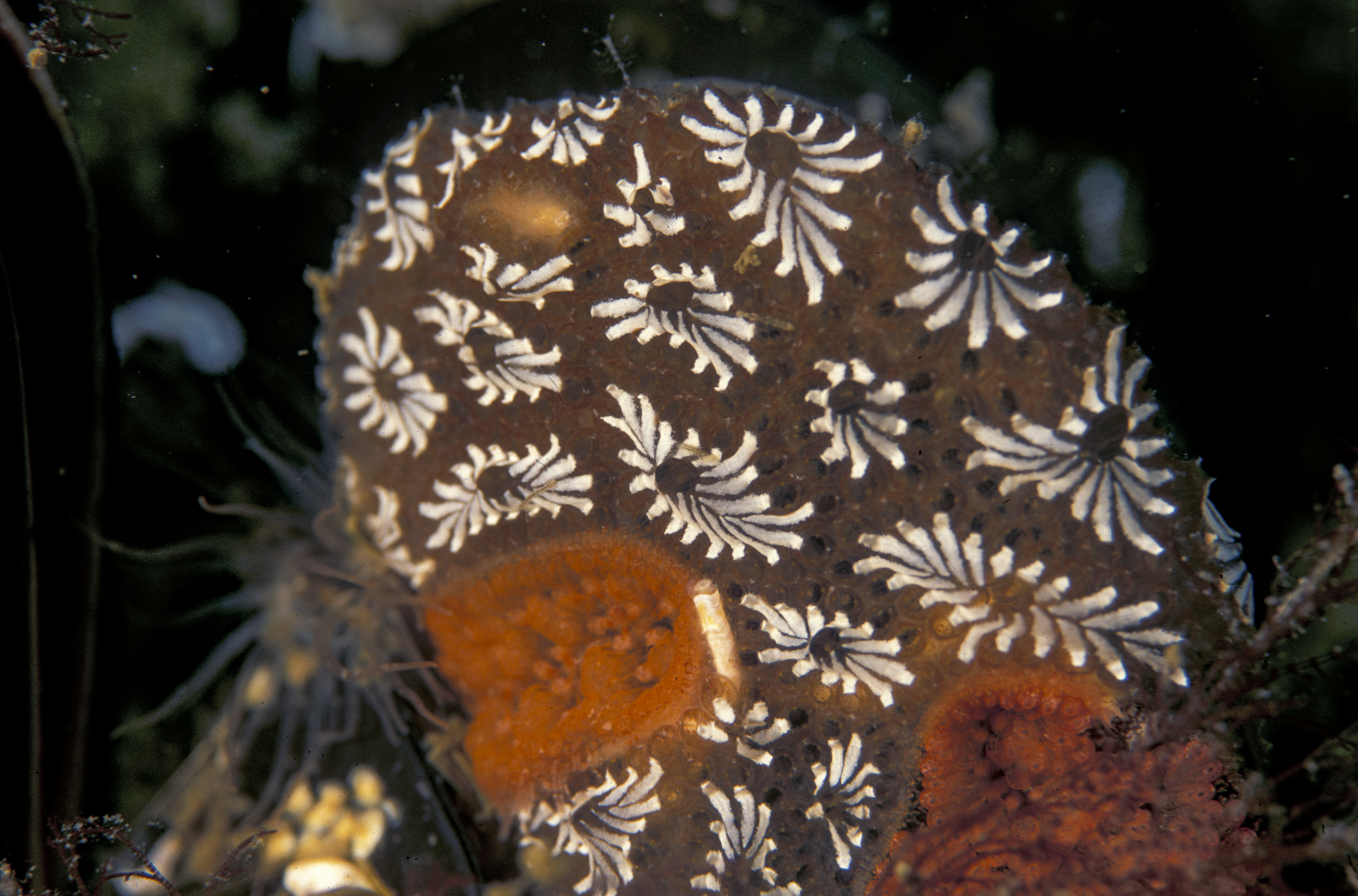 | Description | : | Ascidie coloniale ou synascidie dont tous les individus sont inclus dans une tunique commune. Les orifices inhalants* des zoïdes* sont groupés de façon régulière autour d'un cloaque commun qui occupe une position centrale. |