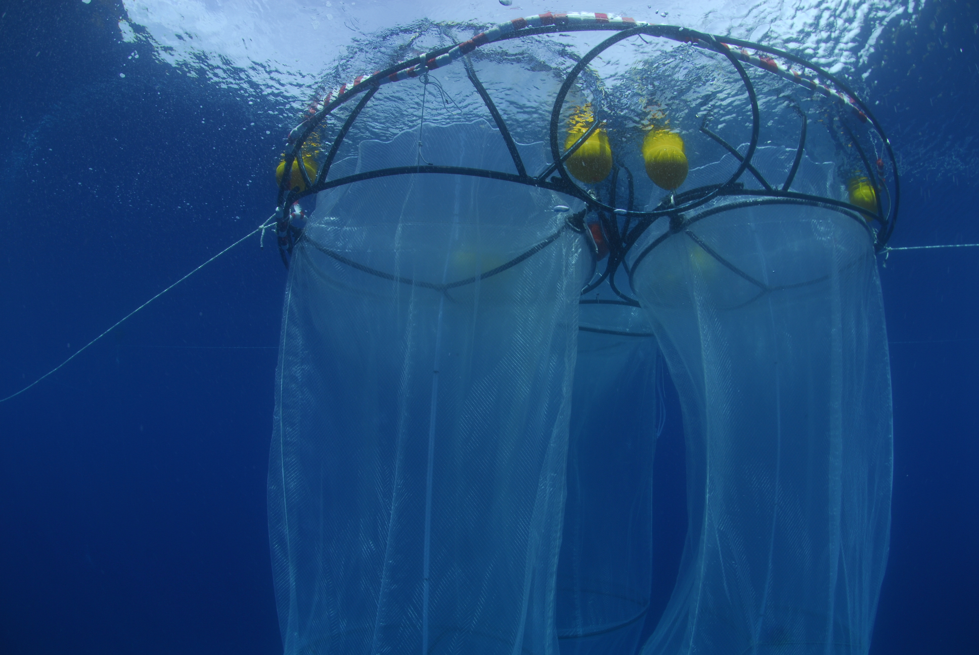 la baie d'Elbo, dans la réserve de Scandola en Corse. Quatre mésocosmes